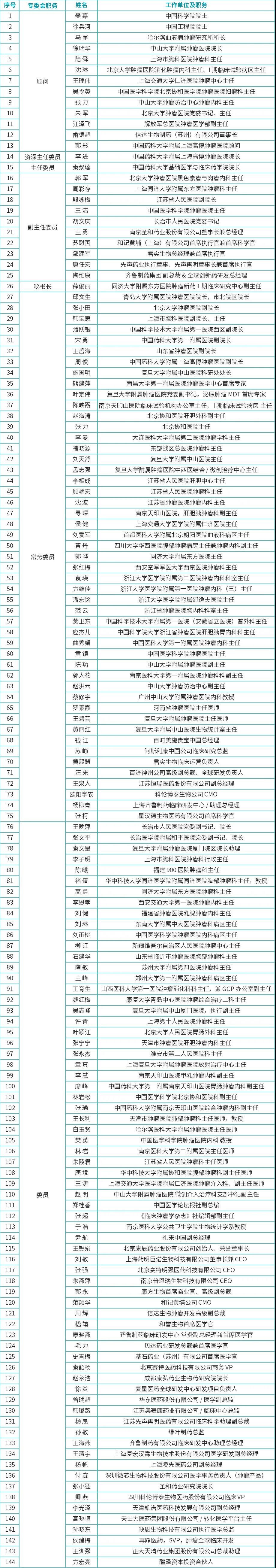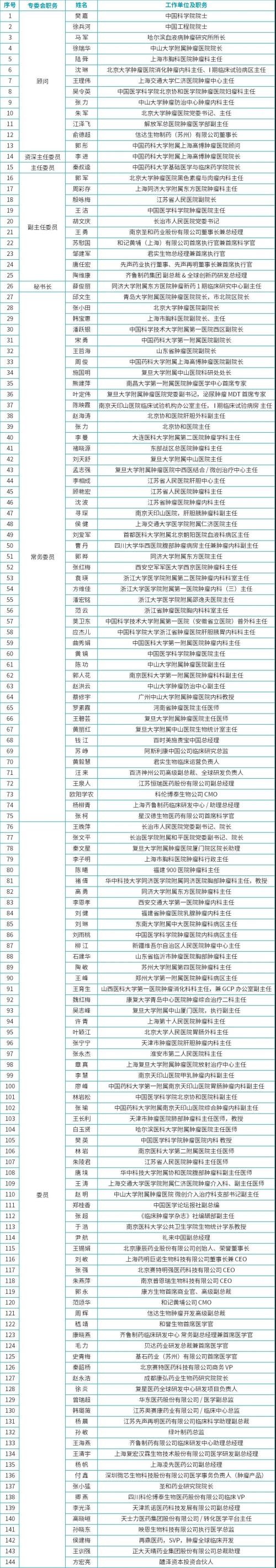 会议同时推举中国科学院院士樊嘉、中国工程院院士徐兵河、哈尔滨血液病肿瘤研究所所长马军、中山大学附属肿瘤医院院长徐瑞华、上海市胸科医院肿瘤科主任陆舜、北京大学肿瘤医院消化肿瘤内科主任、I期临床试验病区主任沈琳、上海交通大学仁济医院肿瘤中心主任王理伟、中国医学科学院北京协和医学院肿瘤医院妇瘤科主任吴令英、中山大学肿瘤防治中心肿瘤内科主任张力、北京大学肿瘤医院党委书记朱军、解放军总医院肿瘤医学部副主任江泽飞、信达生物制药(苏州)有限公司董事长俞德超、中国药科大学附属上海高博肿瘤医院顾问郭彤为第三届抗肿瘤专委会顾问。