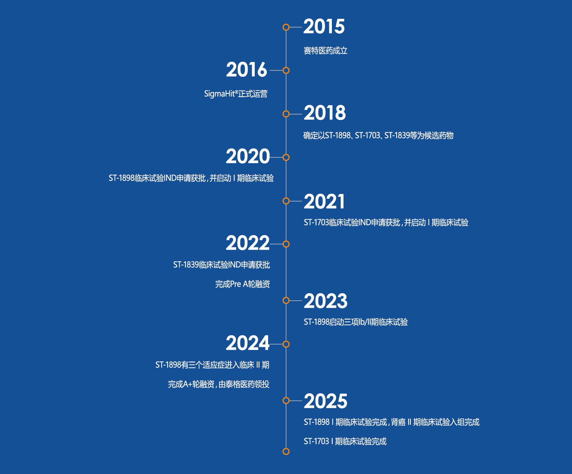 自2015年成立以来,赛特医药开发并不断完善药物设计软件,建立了丰富的自主研发新药管线,拥有数十个内部新药项目,分别处于临床及临床前不同阶段,目前已有一个候选药物在中国获批临床并正在开展II期临床研究,两个候选药物正在开展I期临床研究。SigmaHit®软件在药物发现上的成功应用,已经通过数十种药物的研究数据和国家临床批文等成果,在不同阶段得到了验证。目前赛特医药已拥有授权专利134项,其中国内专利28项,国外专利106项。